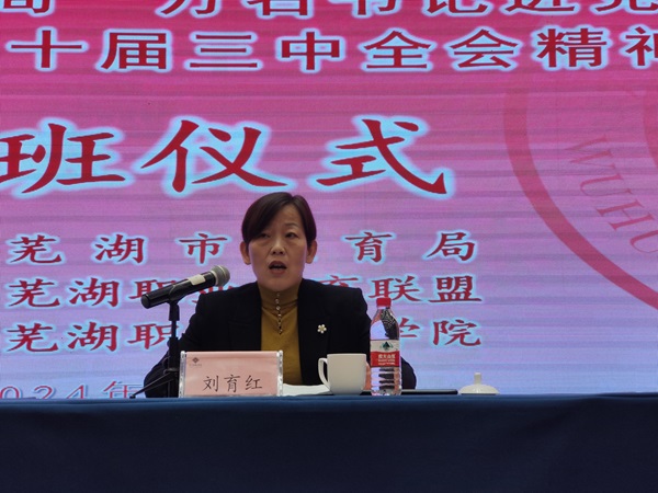 11月6日,由芜湖市教育局主办,芜湖职业教育联盟、芜湖职业技术学院承办的2024年市教育局“万名书记进党校”暨学习贯彻党的二十届三中全会精神培训班,在芜湖新百金陵大酒店举行。芜湖市教育局党委委员、副局长纪慧娟,我校副院长刘育红等出席开班式,仪式由继续教育学院党总支书记赵敬德主持。