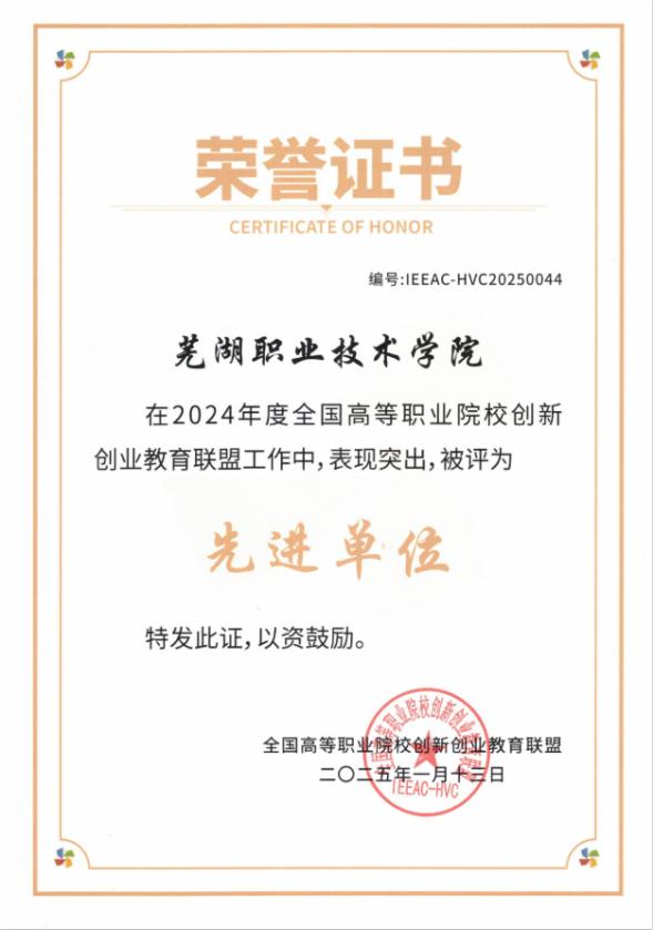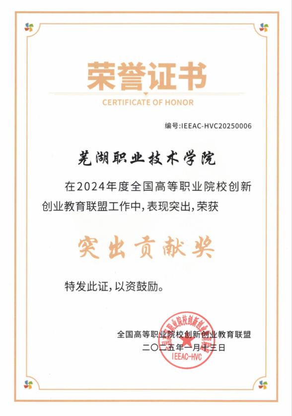 近日,全国高等职业院校创新创业教育联盟(以下简称“联盟”)发布了《关于表彰2024年度全国高等职业院校创新创业教育联盟工作先进单位和先进个人的决定》。我校凭借在创新创业教育领域的卓越表现,荣获“突出贡献奖”荣誉称号,成为全国仅有的7家获此殊荣的高职院校之一。