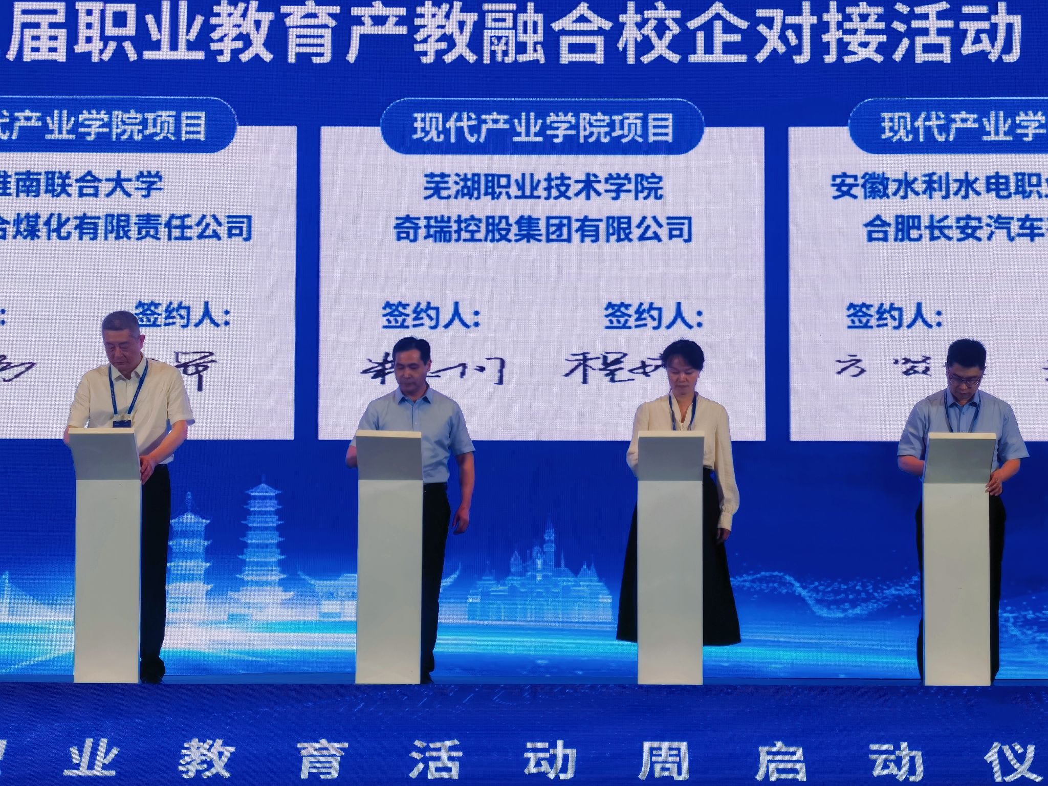 启动仪式上,朱志国代表学校接受“安徽省职业院校现代产业学院”授牌,并与奇瑞控股集团现场签署战略合作协议。